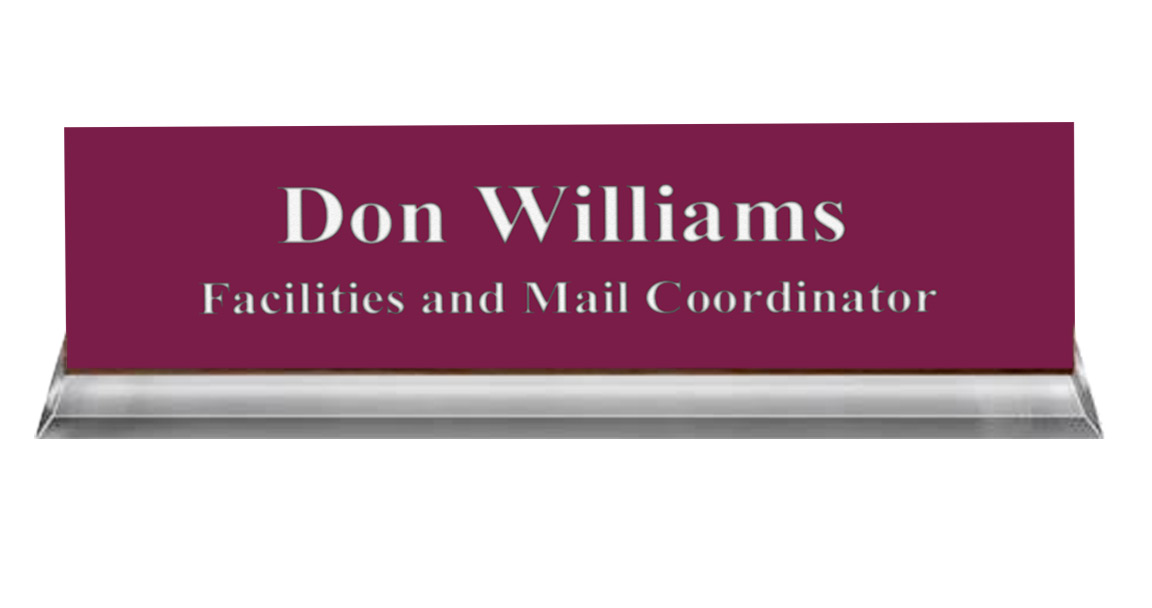 Claret Plastic Plate with White Text, Clear Acrylic Base